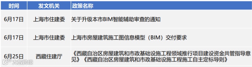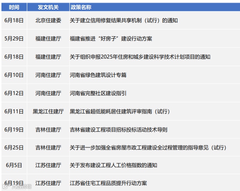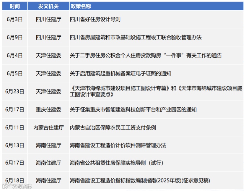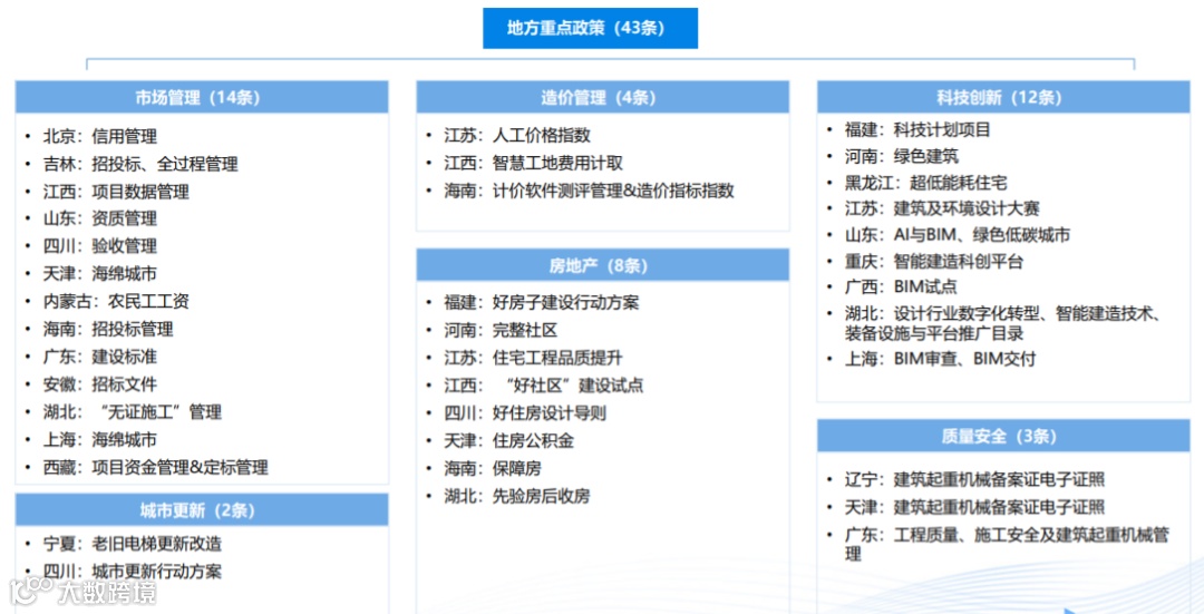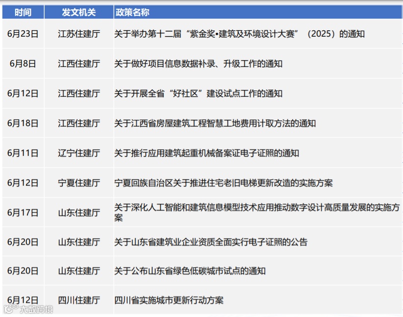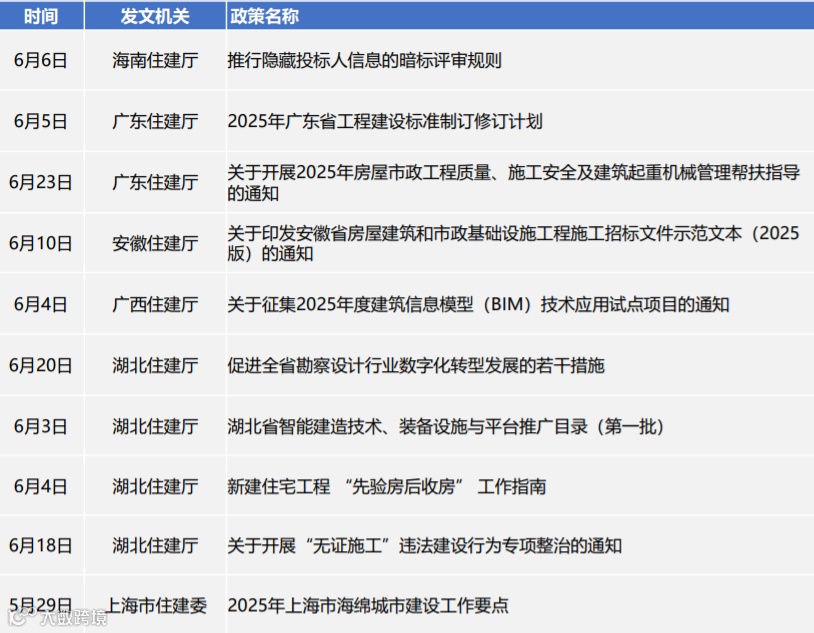 地方政策:本周期内共收集地方政策43条,包括市场管理、造价管理、科技创新、房地产、城市更新、质量安全等方面的内容。造价管理方面,江苏发布人工价格指数;江西发布智慧工地费用计取标准;海南规范计价软件管理并发布造价指标指数。科技创新方面,福建发布科技创新计划;河南推动绿色建筑发展;山东发文支持AI与BIM发展;湖北推动设计行业数字化转型、智能建造技术;上海升级BIM审查,提出BIM交付要求。房地产方面,福建发布好房子建设行动方案;江苏提升住宅工程品质;四川发布好住房设计导则;城市更新领域,四川发布城市更新行动方案。质量安全方面,辽宁及天津推行建筑起重机械电子化证件。