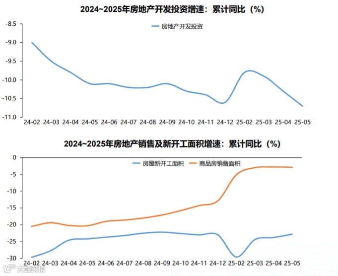 •投资端,1—5月份,全国房地产开发投资36,234亿元,同比下降10.7%(按可比口径计算);其中,住宅投资27,731亿元,下降10.0%。新开工数据则有所向好,房屋新开工面积 23184 万平方米,下降 22.8%,但降幅比 1-4 月收窄 0.5 个百分点,显示出市场在政策刺激下,部分企业开始调整开工节奏。