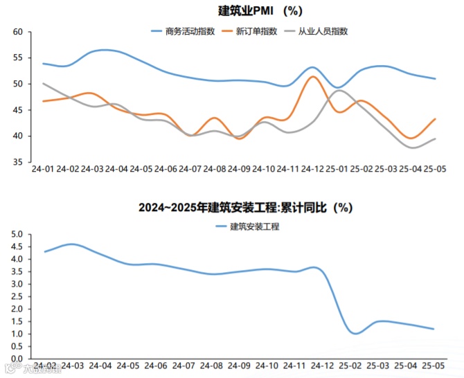 •建筑业商务活动指数为51.0%,较上月下降0.9个百分点,但仍高于 50% 的荣枯线。基建投资的稳定增长、政策支持的持续发力以及区域分化带来的结构性机会,使得行业仍保持在扩张区间。