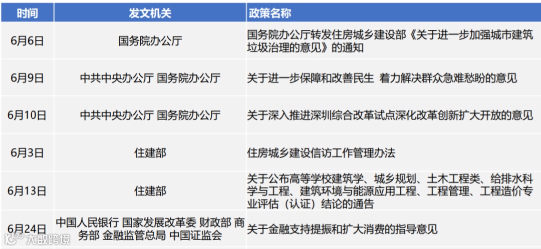 中央政策:本周期内共收集中央政策8条,共涉及政务数据共享、资源环境要素市场化、建筑垃圾治理、保障改善民生问题、深圳改革试点、信访管理、高校专业评估、提振消费等方面内容。国务院发布政务数据共享条例,推进政务数据安全有序高效共享利用,提升政府数字化治理能力和政务服务效能,全面建设数字政府;中共中央办公厅 国务院办公厅发布关于健全资源环境要素市场化配置体系的意见,推动环境资源要素畅通流动、高效配置,增强对资源环境目标的支撑作用;国务院转发住建部关于进一步加强城市建筑垃圾治理的意见,对城市建筑垃圾的产生、收集、贮存、运输、利用和处置各个环节,提出具体管理措施;中共中央办公厅 国务院办公厅印发关于进一步保障和改善民生 着力解决群众急难愁盼的意见,推动民生建设更加公平、均衡、普惠、可及;住建部发布住房城乡建设信访工作管理办法,明确了各级住房城乡建设部门信访工作职责,推进信息化建设,并实行信访工作责任制;中国人民银行、国家发改委等六部门联合印发关于金融支持提振和扩大消费的指导意见,从增强消费能力、扩大金融供给等六个方面提出 19 项举措,以金融支持提振和扩大消费。