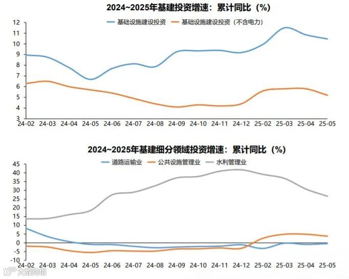 •细分领域呈现显著分化:各领域表现分化,像水上运输业投资增长 27.2%、水利管理业投资增长 26.6%,展现出强大活力,而交通仓储邮政投资中道路运输投资同比 - 0.4%,存在一定下行压力。