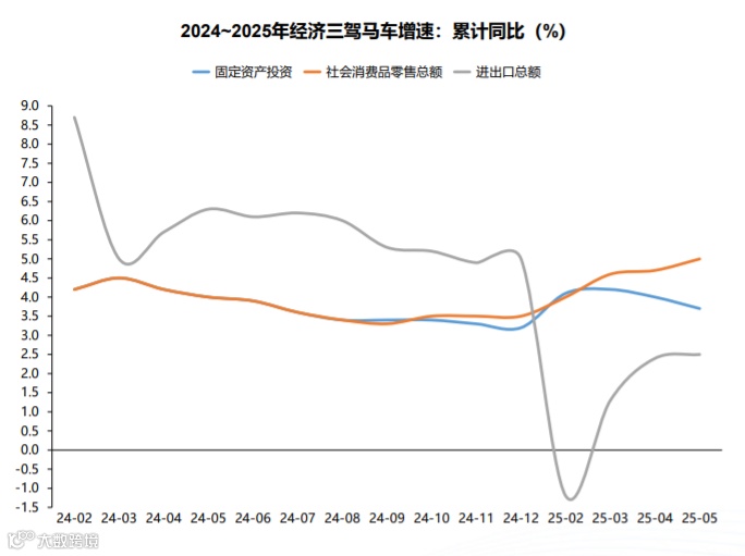宏观经济:1~5月,全国固定资产投资(不含农户)19.19万亿元,同比增长3.7%;社会消费品零售总额 20.32万亿元,同比增长5.0%;货物贸易进出口总值 17.94万亿元,同比增长2.5%。