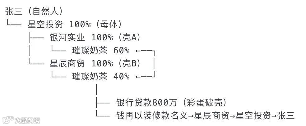 张三揣着1000万,像老母鸡孵蛋——先下一只“金蛋”(星空投资),再让金蛋孵出两只“银蛋”(银河实业、星辰商贸),两只银蛋互相拥抱,又孵出一只“彩蛋”(璀璨奶茶)。银行只见彩蛋光鲜,不知蛋里早被老母鸡掏空了蛋黄。