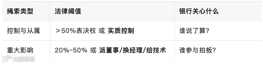 简单说,就是一家公司(或几家)能长期、稳定地决定另一家公司的关键事; 比如招谁当老板、花多少钱、做什么生意。具体分 4 种常见情况,都带例子: