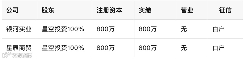 星空投资有限公司:注册资本:1000万(张三100%),像潜水艇,沉在水下,雷达(征信)扫不到。