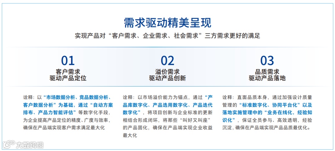 从以上分析可以看出,产品力的提升是围绕产品的全寿命周期,以客户的需求作为起点,以产品交付为终点,涉及产品投资测算、产品定位、标准管理、成本管理、质量管理等全过程、全要素、全场景的实现过程。而在这个过程中,通过数字化的建设将有力地提升其目标性、精准性、客观性,帮助企业全方位提升自身的产品的市场竞争能力并获取良好的经营收益。