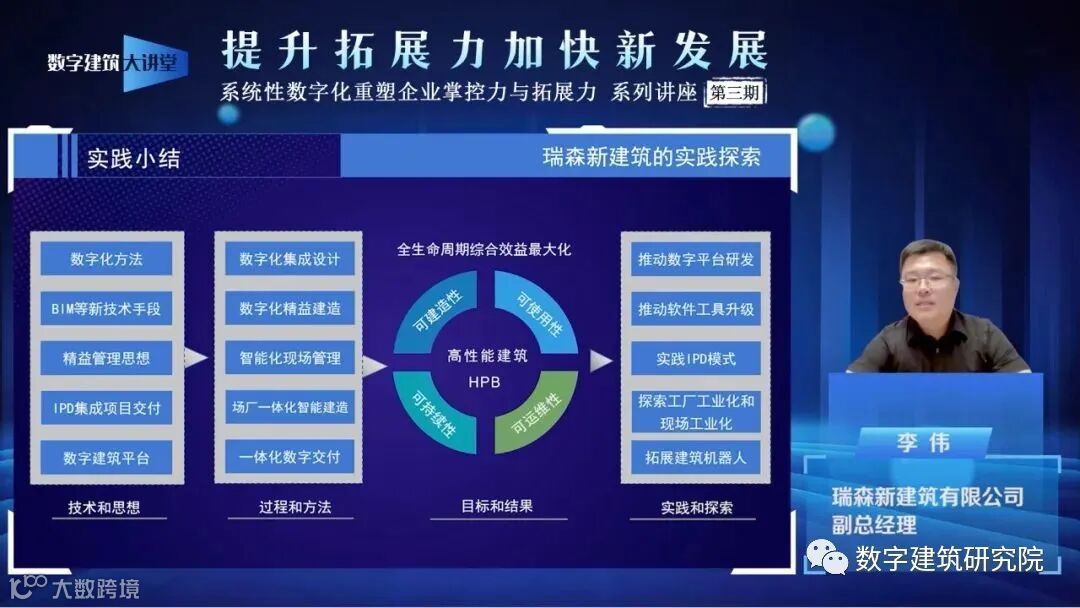 李伟表示,通过运用数字化方法、包括BIM在内的新技术手段、精益管理思想、IPD集成项目交付模式以及涵盖项目设计、建造、运维的数字平台,推动数字化集成设计、数字化精益建造、智能化现场管理、场厂一体化智能建造以及一体化数字交付,最终打造可建造、可使用、可运维、可持续的高性能建筑,实现建筑全生命周期综合效益的最大化。