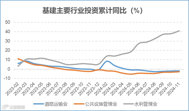 1—11月份,基础设施投资同比增长9.39%,增速比上月增长0.4个百分点,不含电力投资增长4.2%。其中道路运输业投资同比下降1.9%,降幅进一步收窄0.2个百分点,公共设施管理业投资下降2.9%,降幅收窄0.5个百分点,水利管理业投资增长40.9%,增幅上升3个百分点。