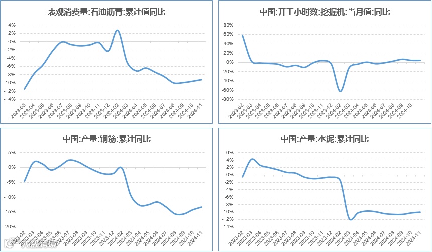 从基建实物工作量来看,2024年1-11月石油沥青表观消费量3415.79万吨,同比下降9.2%,降幅收窄0.4个百分点;挖掘机开工小时数105.4小时/月,同比增长4.4%;钢筋及水泥产量同比分别增长-13.4%及-10.1%,降幅环比收窄。