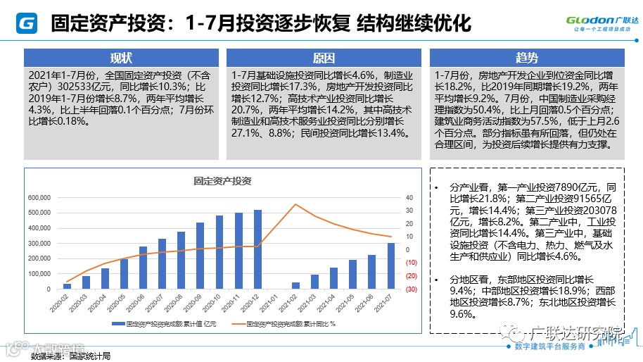 1.宏观经济: 2021年1-7月份,全国固定资产投资(不含农户) 302533亿元,同比增长10.3%,两年平均增长4.3%;1-7月份,社会消费品零售总额同比增长20.7%;两年平均增长4.3%。1-7月份,我国进出口总值21.34万亿元人民币,同比增长24.5%,比2019年同期增长22.3%。
