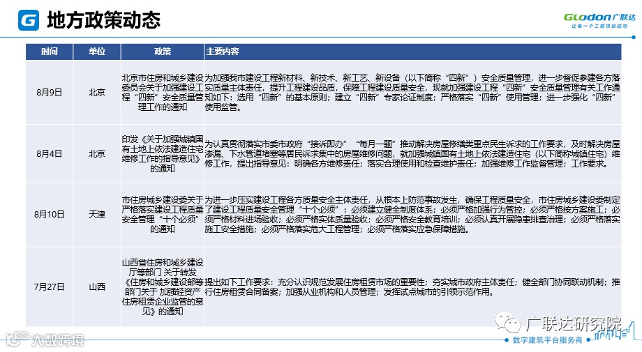 1.政府客户:科技部开展建议征集工作;住建部、工信部联合召开智慧城市交流会;天津全面启用电子证书;重庆开展数字建造试点;上海启动城市更新方案评选;天津、重庆、河北等地推动旧改;新疆改善交通,推动城市更新;河南完成示范工地认定;湖南成立绿色建造专家委员会;广西加强农房管理。