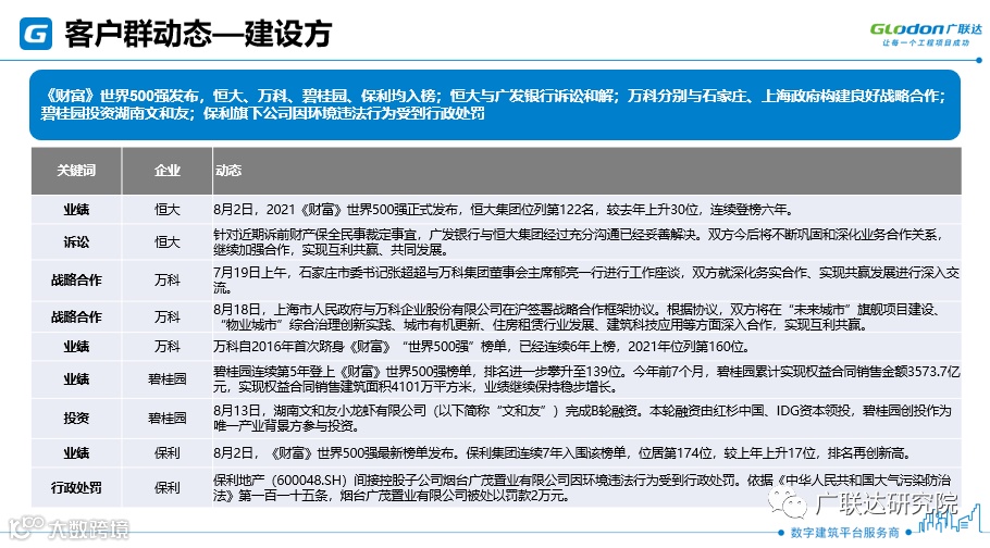 2.建设方客户:恒大与广发银行诉讼和解;万科与上海市人民政府在沪签署战略合作框架协议;碧桂园投资湖南文和友。