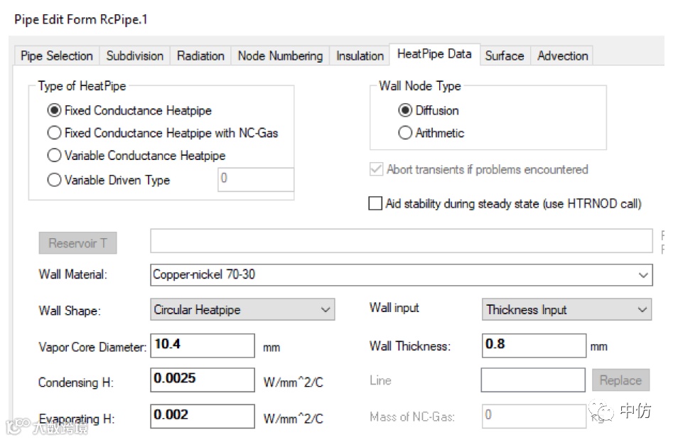 热管使用70/30铜镍管,总长为550mm,其外径为12mm,内径假设为10.4mm,内部通水作为工作流体。热管的蒸发和冷凝换热系数均假设为常数,且通过已有信息进行估算,蒸发系数假设为2000W/m2-K,冷凝系数假设为2500W/m2-K。