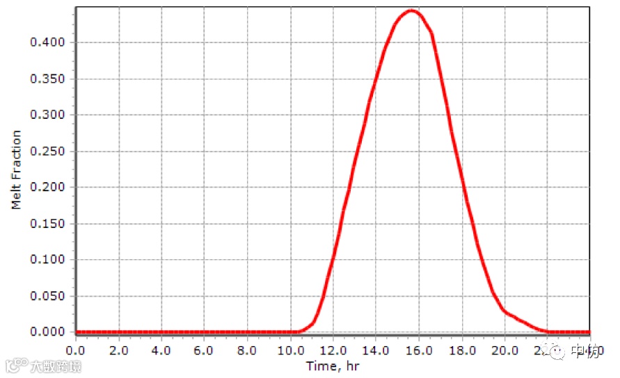 下图为一天中不同时刻下的PCM液态分数。可以看到,整个夜间PCM都保持为全固态状态,清晨时段的能量不是通过相变来提供的,而是通过PCM冷却来部分满足的。同时,液态分数最高只有45%,这表示有超过一半的PCM始终是固态。
