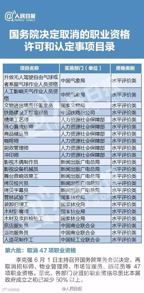 6月1日召开的国务院常务会议决定,在两年已分五批取消272项职业资格许可和认定事项基础上,再取消招标师、物业管理师、市场管理员、插花员等47项职业资格。至此,近两年来,共有319项职业资格许可和认定事项被取消。