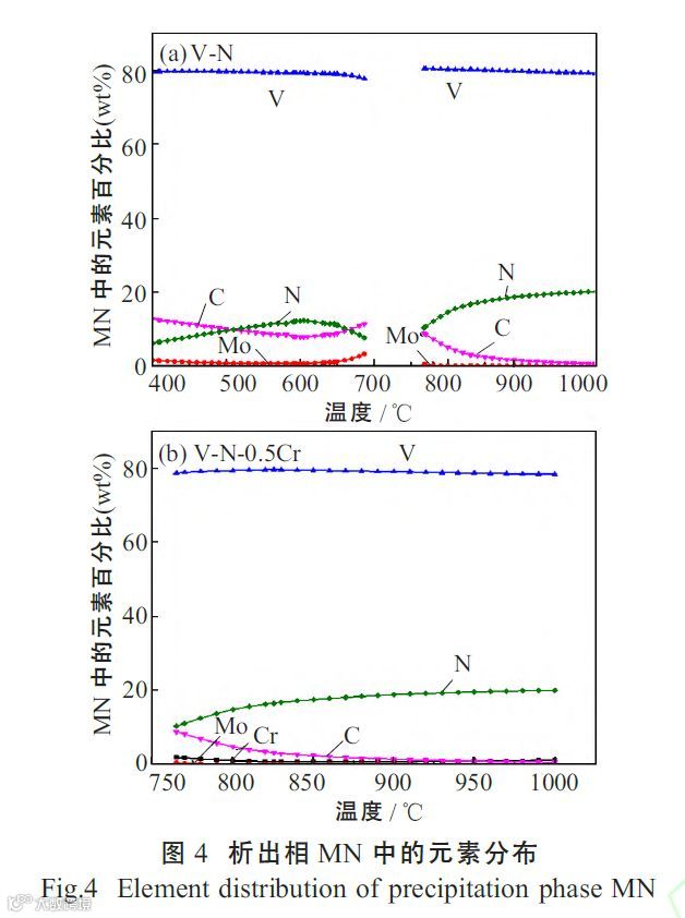 图4 给出了MN 析出相中元素比例分布与对应温度的热力学计算结果。由图4(a)可见,V-N 微合金钢的MN 析出相的析出过程分为两个阶段,高于768℃以上的高温析出阶段和低于687℃的中低温析出阶段, 高温析出阶段为侧重分析部分。图4 (b)中V-N-0.5Cr 微合金钢中Cr、Mo、V、C、N 五种元素在MN 中的比例和趋势与V-N 钢大致相同。与M(C,N)不同,在MN 中V 元素所占分数比例最大,其次是N,N 的占位百分数在15%左右,C 的占位分数随温度的升高而逐渐变小,直至稳定状态。