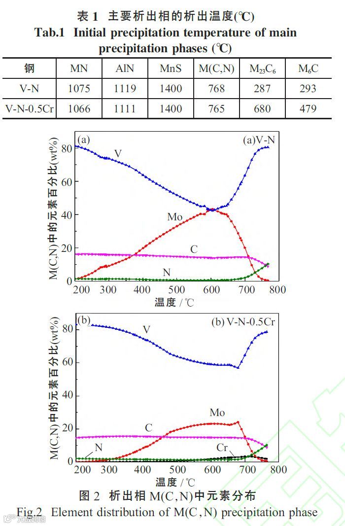 图2 给出了析出相M(C,N)中元素比例分布与对应温度的热力学计算结果。