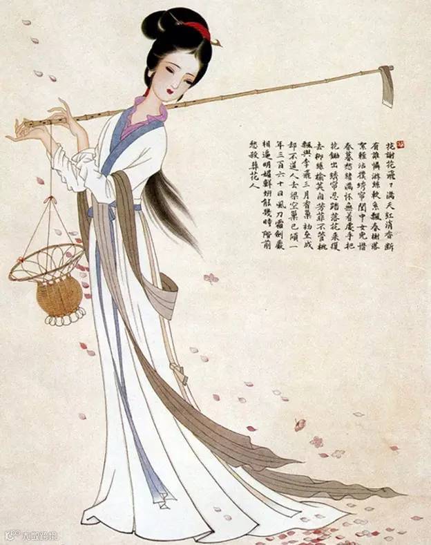 那一日正当三月中浣,早饭后,宝玉携了一套《会真记》,走到沁芳闸桥边桃花底下一块石上坐着,展开《会真记》,从头细玩。正看到“落红成阵”,只见一阵风过,把树头上桃花吹下一大半来,落的满身满书满地皆是。宝玉要抖将下来,恐怕脚步践踏了,只得兜了那花瓣,来至池边,抖在池内。那花瓣浮在水面,飘飘荡荡,竟流出沁芳闸去了。回来只见地下还有许多,宝玉正踟蹰间,只听背后有人说道:“你在这里做什么?”宝玉一回头, 却是林黛玉来了,肩上担着花锄,锄上挂着花囊,手内拿着花帚。