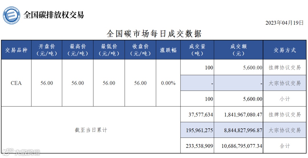 截至今日,全国碳市场碳排放配额(CEA)累计成交量233,538,909吨,累计成交额10,686,795,077.34元。