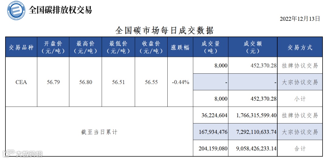 截至今日,全国碳市场碳排放配额(CEA)累计成交量204,159,080吨,累计成交额9,058,426,233.14元。