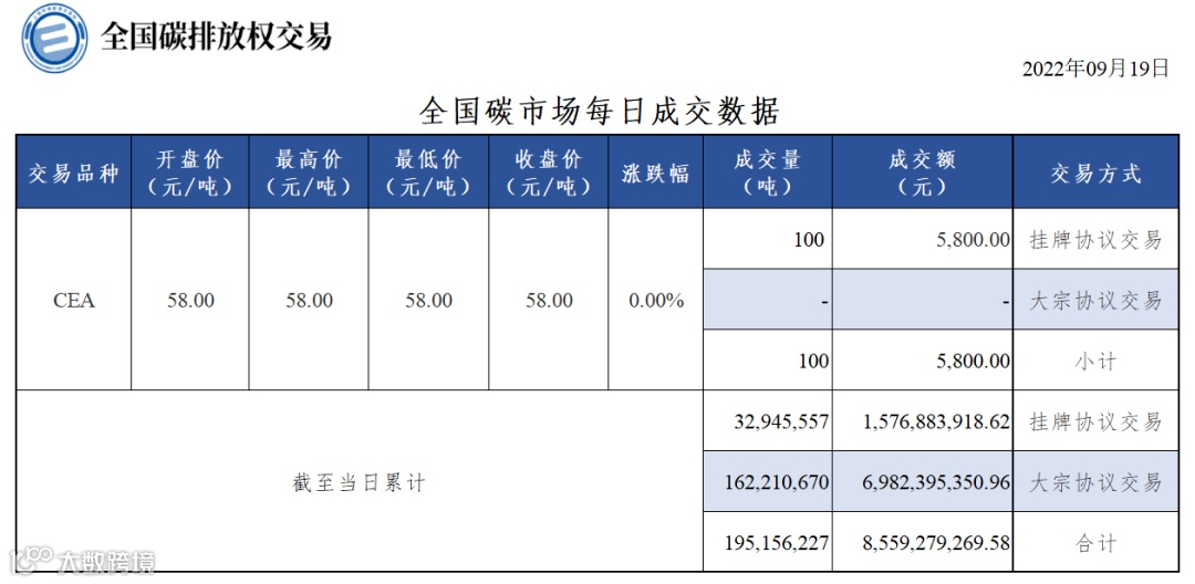 截至今日,全国碳市场碳排放配额(CEA)累计成交量195,156,227吨,累计成交额8,559,279,269.58元。