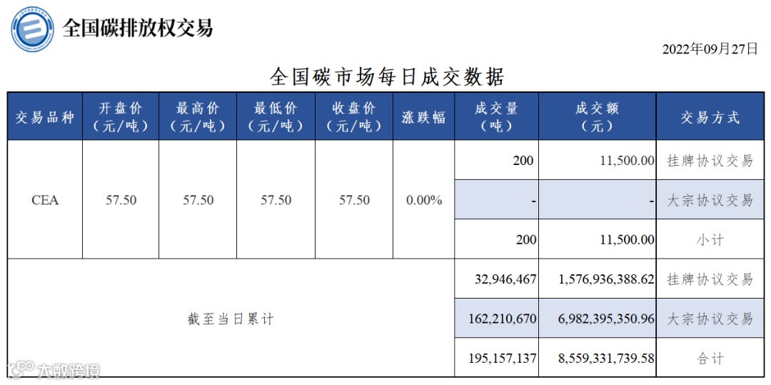 截至今日,全国碳市场碳排放配额(CEA)累计成交量195,157,137吨,累计成交额8,559,331,739.58元。