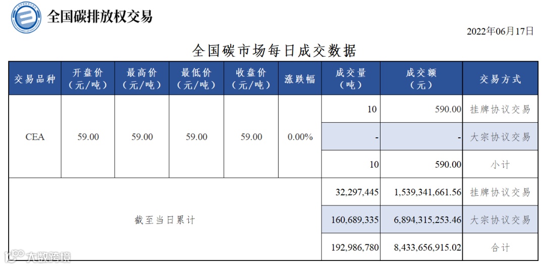 截至今日,全国碳市场碳排放配额(CEA)累计成交量192,986,780吨,累计成交额8,433,656,915.02元。