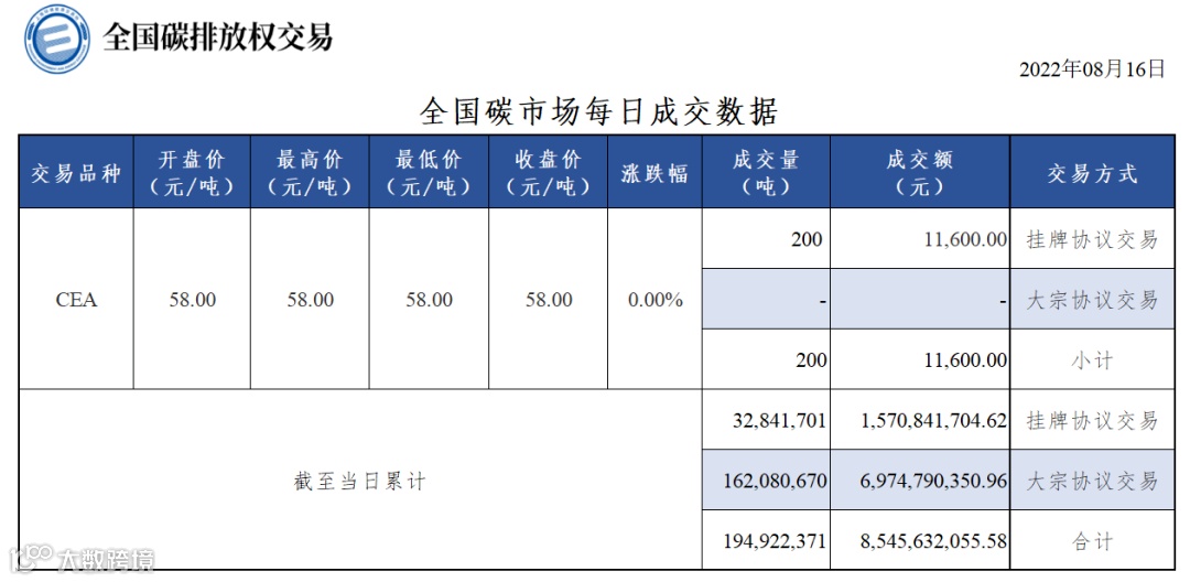 截至今日,全国碳市场碳排放配额(CEA)累计成交量194,922,371吨,累计成交额8,545,632,055.58元。
