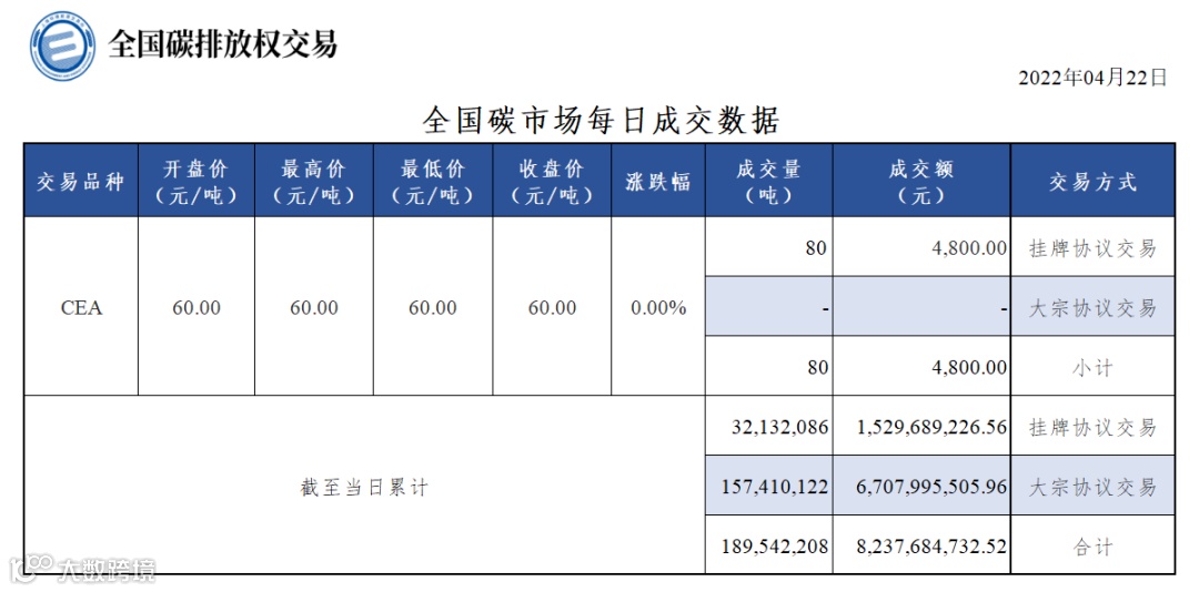 截至今日,全国碳市场碳排放配额(CEA)累计成交量189,822,218吨,累计成交额8,252,805,332.52元。