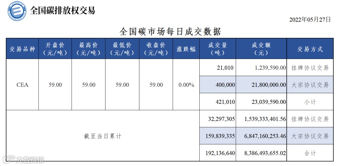 截至今日,全国碳市场碳排放配额(CEA)累计成交量192,136,640吨,累计成交额8,386,493,655.02元。