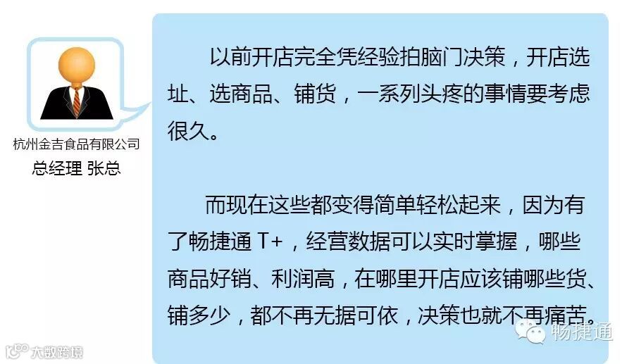 经过这一年的应用,畅捷通T+给杭州金吉食品的管理带来了全新的改变。对张总来讲,最重要的一点是企业发展的瓶颈获得了突破,开店速度加快,让杭州金吉食品走上了快车道。