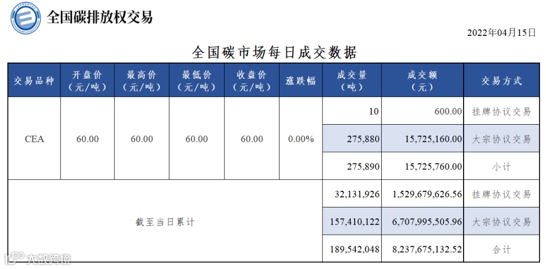 截至今日,全国碳市场碳排放配额(CEA)累计成交量189,542,058吨,累计成交额8,237,675,732.52元。