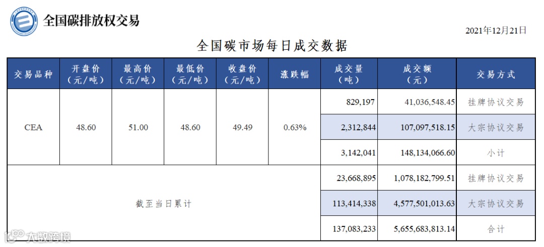 截至今日,全国碳市场碳排放配额(CEA)累计成交量137,083,233吨,累计成交额5,655,683,813.14元。