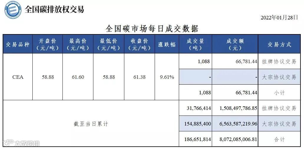 截至今日,全国碳市场碳排放配额(CEA)累计成交量186,651,814吨,累计成交额8,072,085,006.81元。