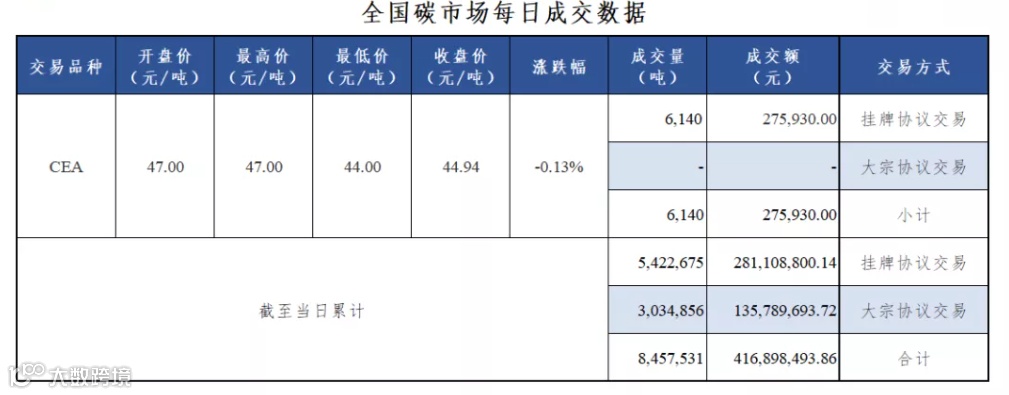 截至今日,全国碳市场碳排放配额(CEA)累计成交量8,457,531吨,累计成交额416,898,493.86元。