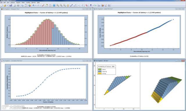 RocTopple软件有功能强大的概率分析功能,简单易用,模型几何、抗剪强度以及外部荷载等参数都可以进行不确定性分析。使用蒙特卡罗或拉丁立方体样本,进行概率分析,计算出安全系数以及失效概率。直方图、累积曲线图以及散点图都可以进行输出,同时计算结果还可以一键输出到Excel。
