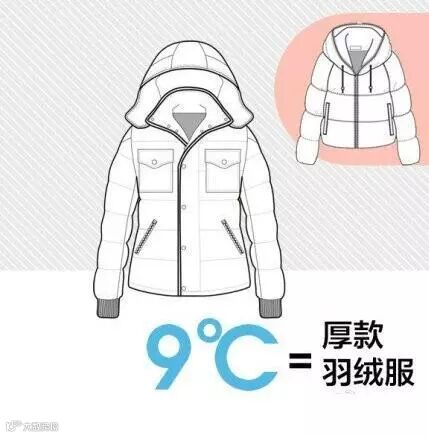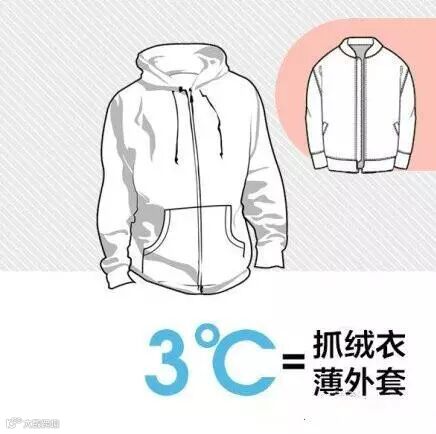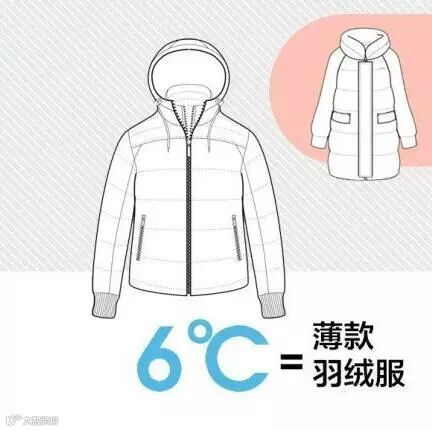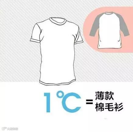 较厚的羽绒服相当于9℃,薄款羽绒服相当于6℃,稍厚的棉衣是5℃,厚羊毛衫是4℃,棉背心4℃,抓绒衣服、薄外套是3℃,厚的棉毛衫2℃,薄的棉毛衫是1℃等。若温度为22℃,那么穿一件短袖T加一件薄外套就可以。很实用,转给大家!