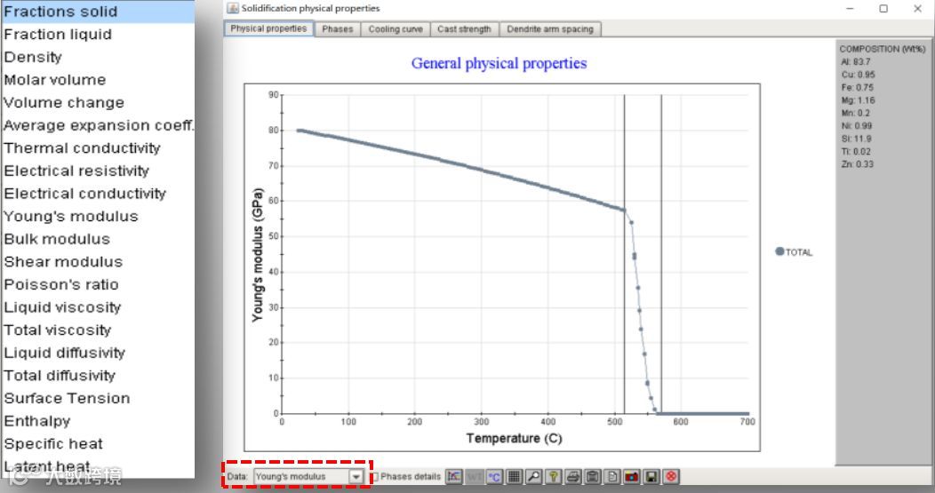 JMatPro 是一套功能强大的金属材料相图计算与材料性能模拟软件,尤其针对应用于实际工业的多组分合金。使用JMatPro可以设计合金成分,开发新合金,改进各种热处理工艺、与CAE软件一起进行工艺流程设计。主要的功能有稳态和亚稳态相图计算、凝固过程以及性能计算、机械性能计算、物理和热物性能计算、相转变动力学计算以及化学性能计算等。目前可以计算的合金类型包括铝合金、镁合金、铸铁、通用钢、不锈钢、钴合金、镍合金、镍铁合金、镍基单晶合金、钛合金、锆合金、焊料合金、铜合金。