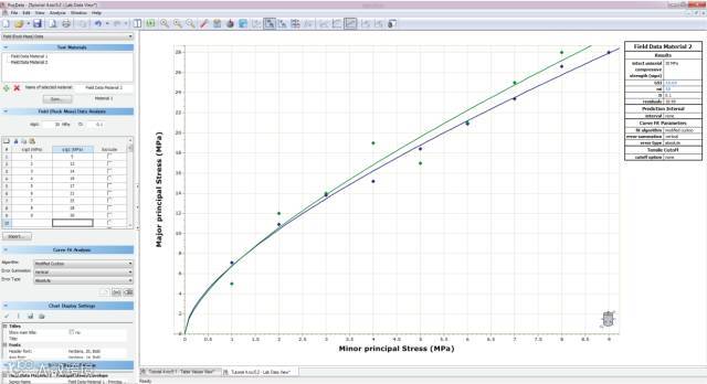 破坏包络线可以由剪切-法向和主应力空间两种形式绘制。由RocData生成的剪切-法向应力包络线可以应用于像极限平衡的边坡稳定分析,而主应力包络线可以用于地下开挖模拟。RocData是一款高度交互式的程序,这允许用户轻松地进行不同强度参数的试验,以观察数据怎样影响强度包络线,使用户更好地理解材料强度这一概念的内涵。