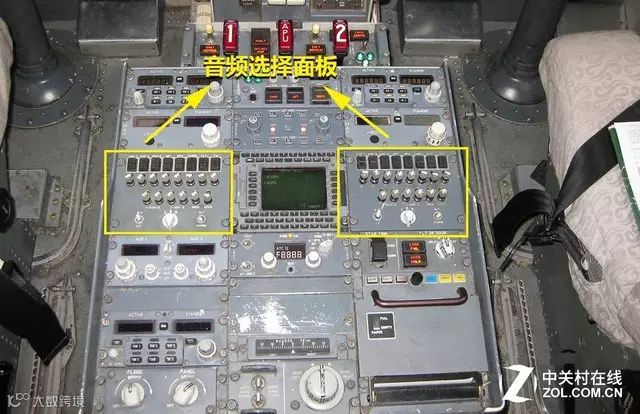 音频选择面板同样设计了左右两个完全一样的区域,分别适用于机长和副驾驶。最上面的一排按钮是切换与不同频道通话所用,比如与广播内通话、机组人员通话、做机内广播等等。中间的两排旋钮是调节不同频段通话音量所用。