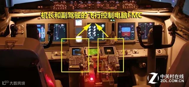 下面两个带有键盘和显示器的装置,就是飞行控制电脑FMC,机长和副驾驶一人一个。机长和副驾驶会在FMC中输入他们需要的航线、飞行高度等等相关的此次飞行的参数。FMC会计算出这次飞行的最佳速度分配、飞行时间、油量等等信息,反馈给驾驶员。驾驶员还能够输入自定义的飞行规则,然后FMC就会遵守这些规则。当然,FMC还有其它功能,比如紧急情况下寻找最近的机场、计算等待航线等等。两个FMC中间就是另一块DU。