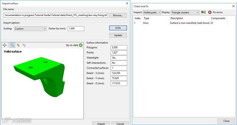 整合后的+CAD模块支持导入STL/CAD模型作为Surface对象(与Mask平级),支持布尔运算,模型检查和修复,缩放和移动,分组等操作。STL检查工具支持对non-manifold和自相交(self-intersecting)模型直接进行修复。 软件同时提供特征检查工具,允许用户定义STL文件需要保留原始模型的最小特征尺寸。