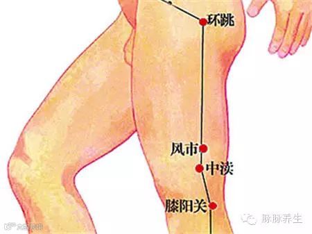 胆经在下肢的巡行路线是沿股、下肢外侧中线下行至小趾、次趾之间。有个很容易找到的标志,就是沿着裤子中间的那条线至膝盖侧面处,主要是环跳、风市、中渎、膝阳关四个穴位。