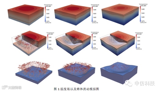 下图是对定向凝固过程的三维模拟,图1中显示了温度梯度变化以及熔体流动的变化。