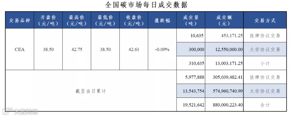 截至今日,全国碳市场碳排放配额(CEA)累计成交量19,521,642吨,累计成交额880,000,223.40元。