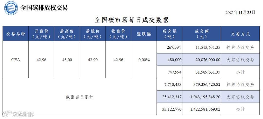 截至今日,全国碳市场碳排放配额(CEA)累计成交量37,228,212吨,累计成交额1,596,517,721.94元。