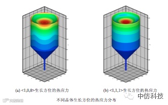 利用FEMAG/CZ软件可以分析计算各向异性热应力。下图所示分别是不同晶体生长方位上的热应力分布。晶体生长方位不同,热应力的分布明显不同。