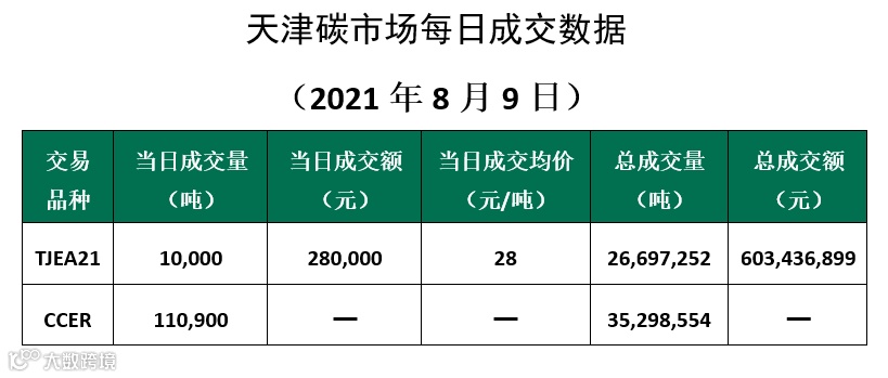截至今日,天津碳市场配额累计成交26,697,252吨,成交金额603,436,899元;CCER累计成交35,298,554吨。