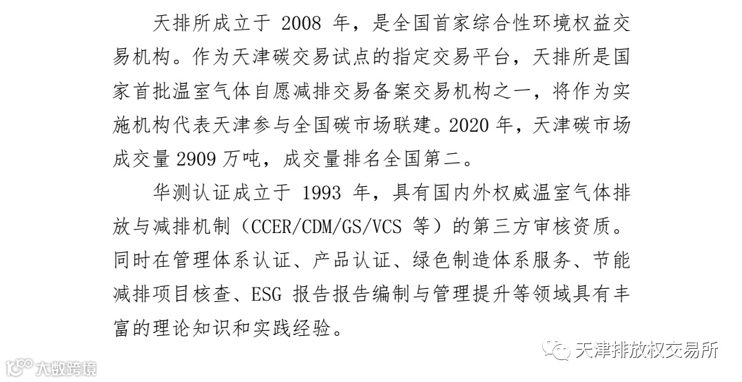 天津排放权交易所成立于2008年9月,是全国首批综合性环境权益交易机构,也是天津区域碳市场和主要污染物市场指定交易平台,国家发改委认定的全国碳市场能力建设(天津)中心,商务部指定的天津碳普惠创新示范中心,天津市指定的全国碳市场联建实施机构。