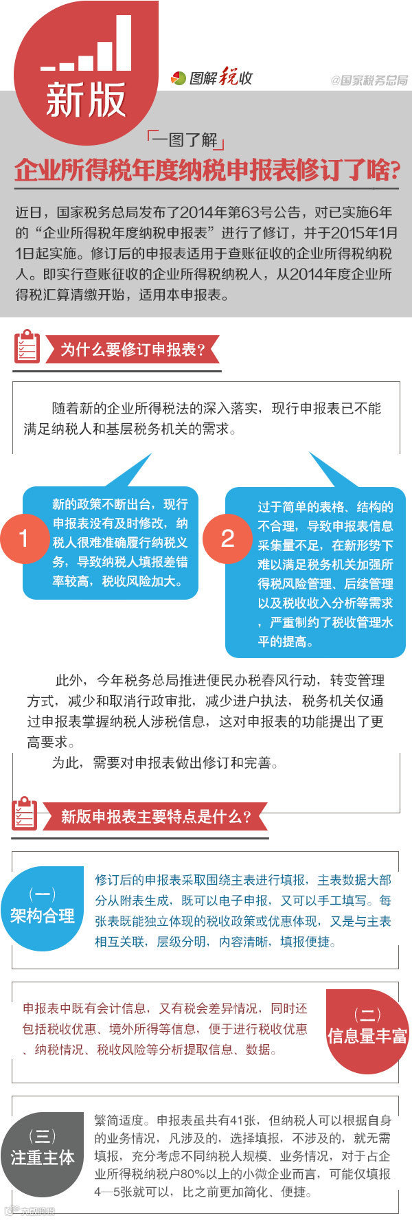 近日,国家税务总局发布“企业所得税年度纳税申报表”的公告,公布修订后的《中华人民共和国企业所得税年度纳税申报表(A类,2014年版)》及《中华人民共和国企业所得税年度纳税申报表(A类,2014年版)填报说明》,自2015年1月1日施行。